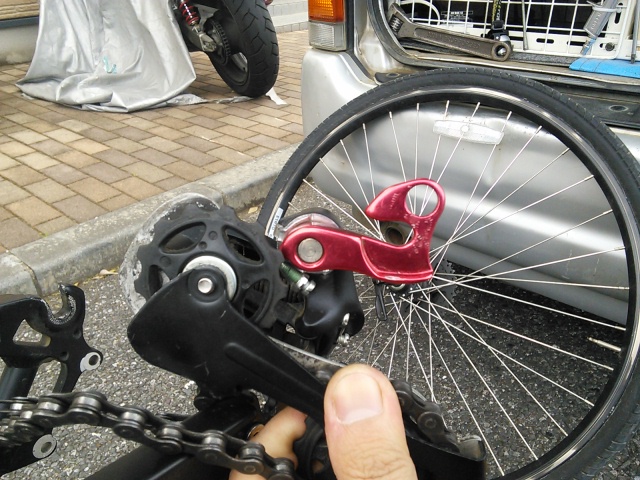 ディレーラーという変速機が曲がってしまったようで、チェーンラインが真っ直ぐにならず、変速もペダルを漕ぐことも出来なくなっていました。