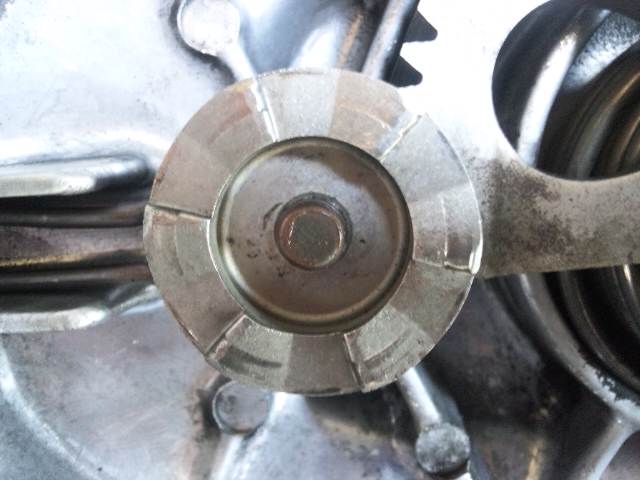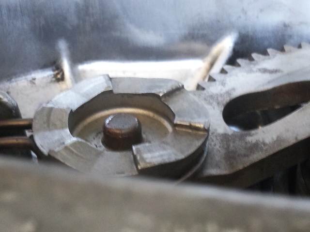 これがプーリー。それほど減っていませんが、右端のおさえるプレートのギヤ溝が減っていたので、今回は丸ごと社外品に換えてみました。