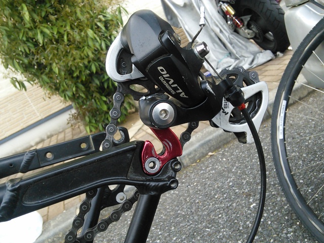 どうやらディレーラーハンガーという赤い部品もダメなようで、この自転車のメーカー専用の部品らしく、預り修理で取り寄せの後、修理・納車致しました。