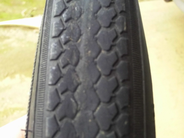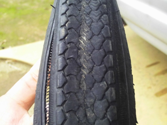 タイヤの真ん中も山がなくなって溝が殆どありませんが、パンクしたまま走ったりすると側面が割れて裂けてしまいます。